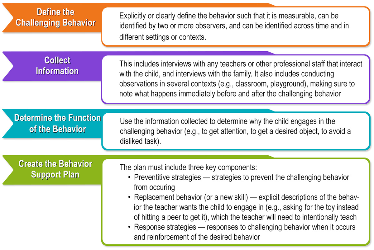 - Select strategies—Once the teacher and families have shared information and feel as if they have some idea about why the child is displaying the challenging behavior, they can work together to select strategies to use to improve the child’s behavior.