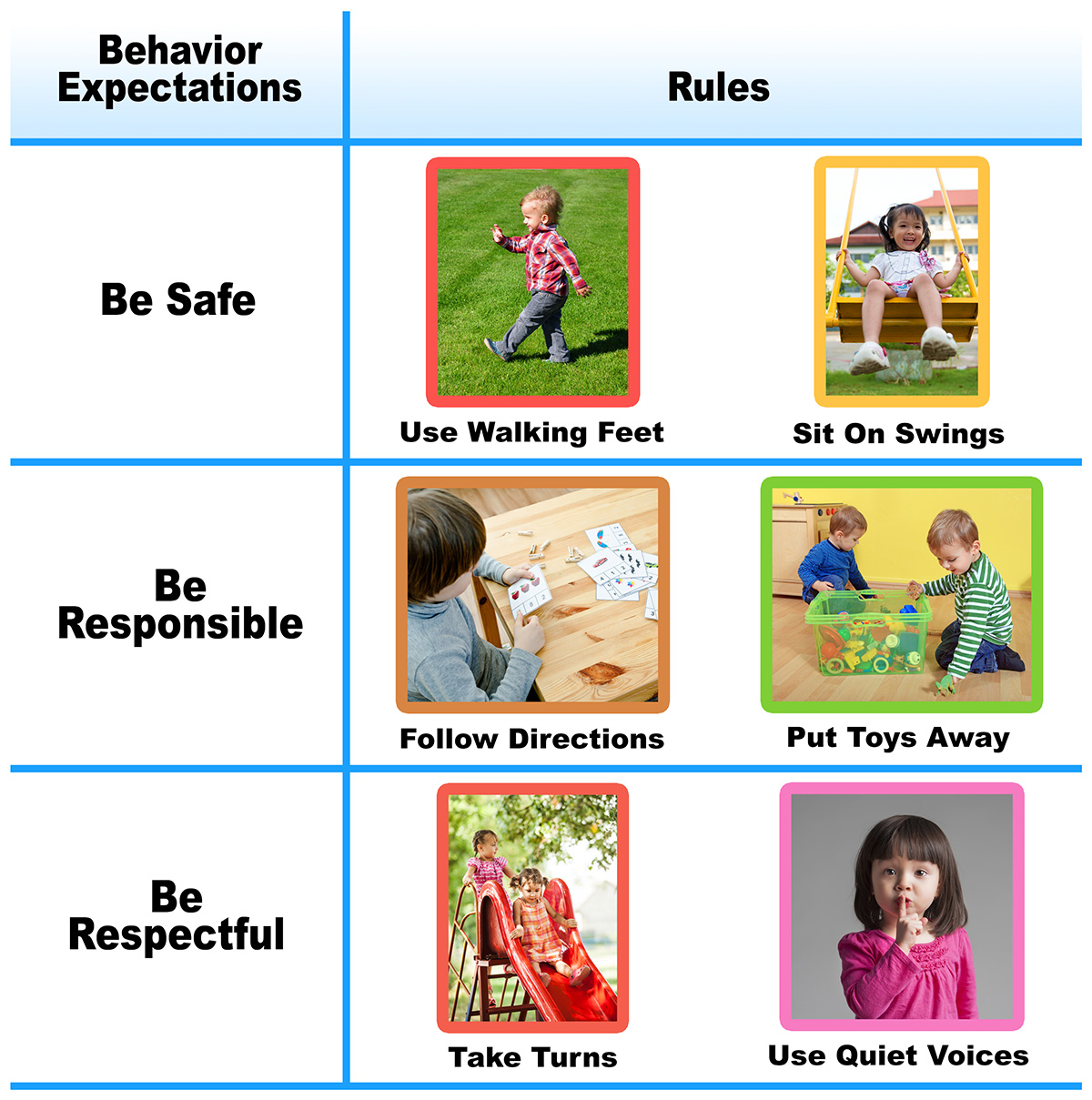 The graphic below provides examples of classroom rules that a teacher might develop to reflect a program’s behavior expectations.